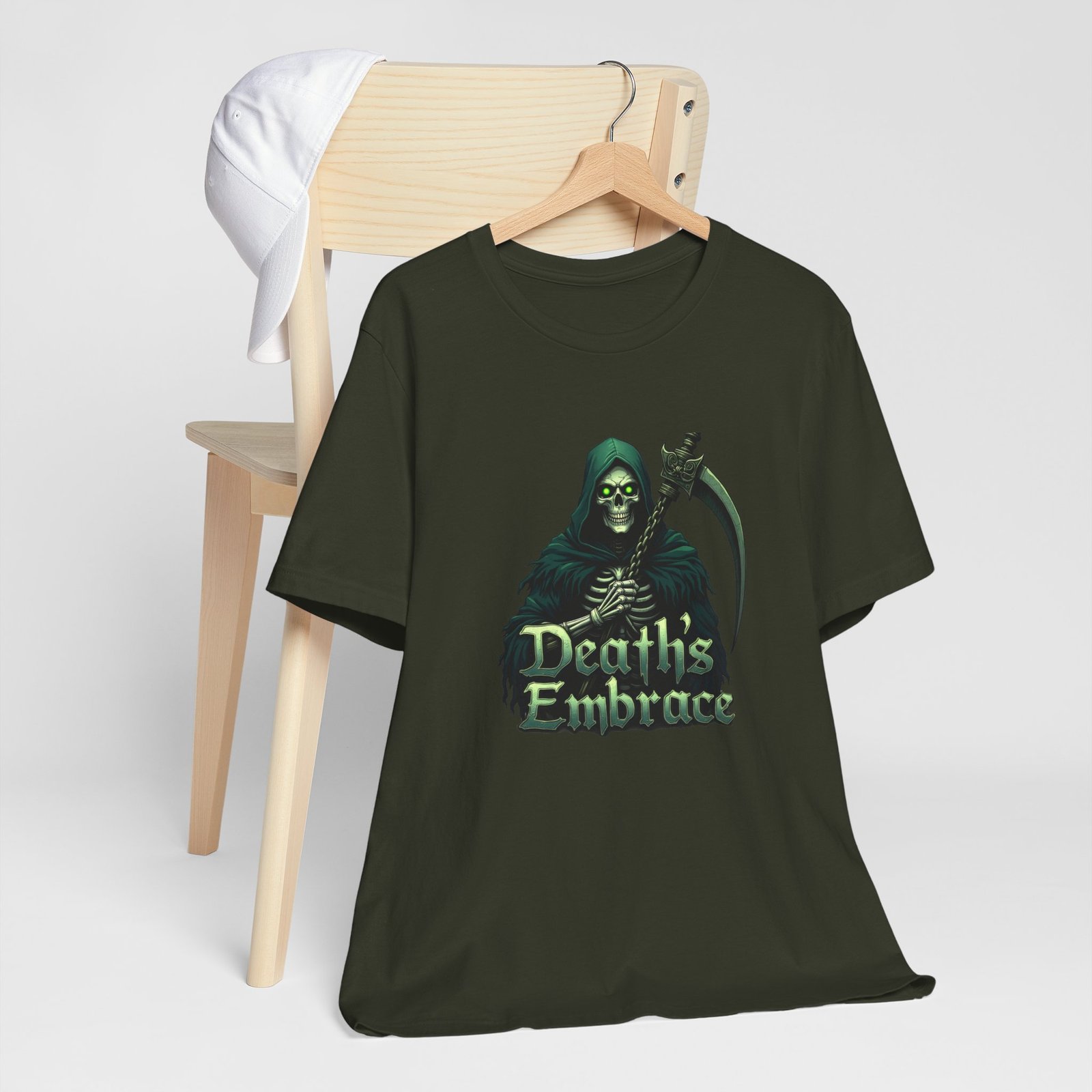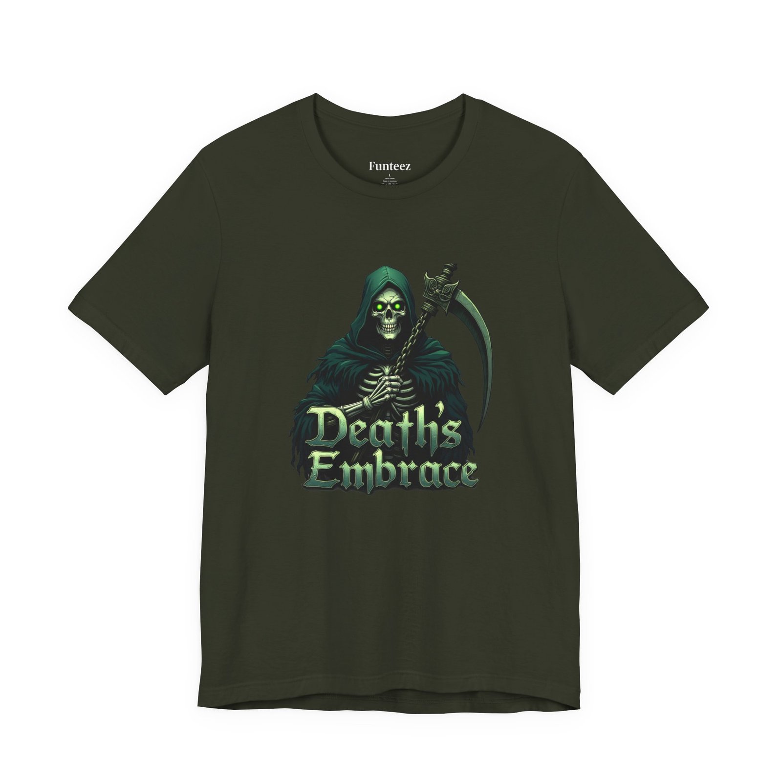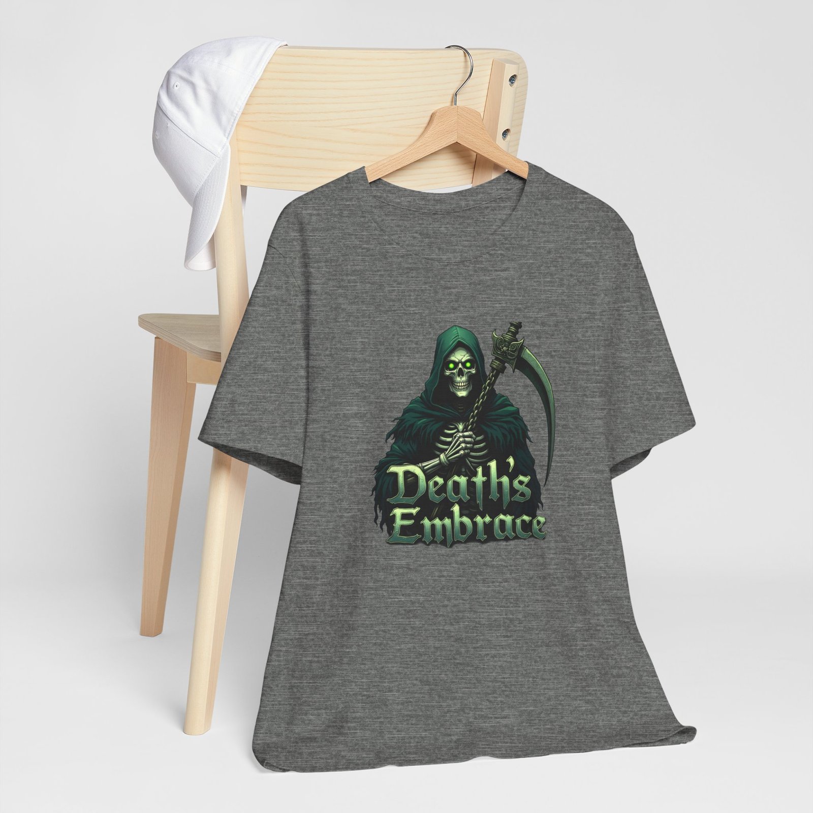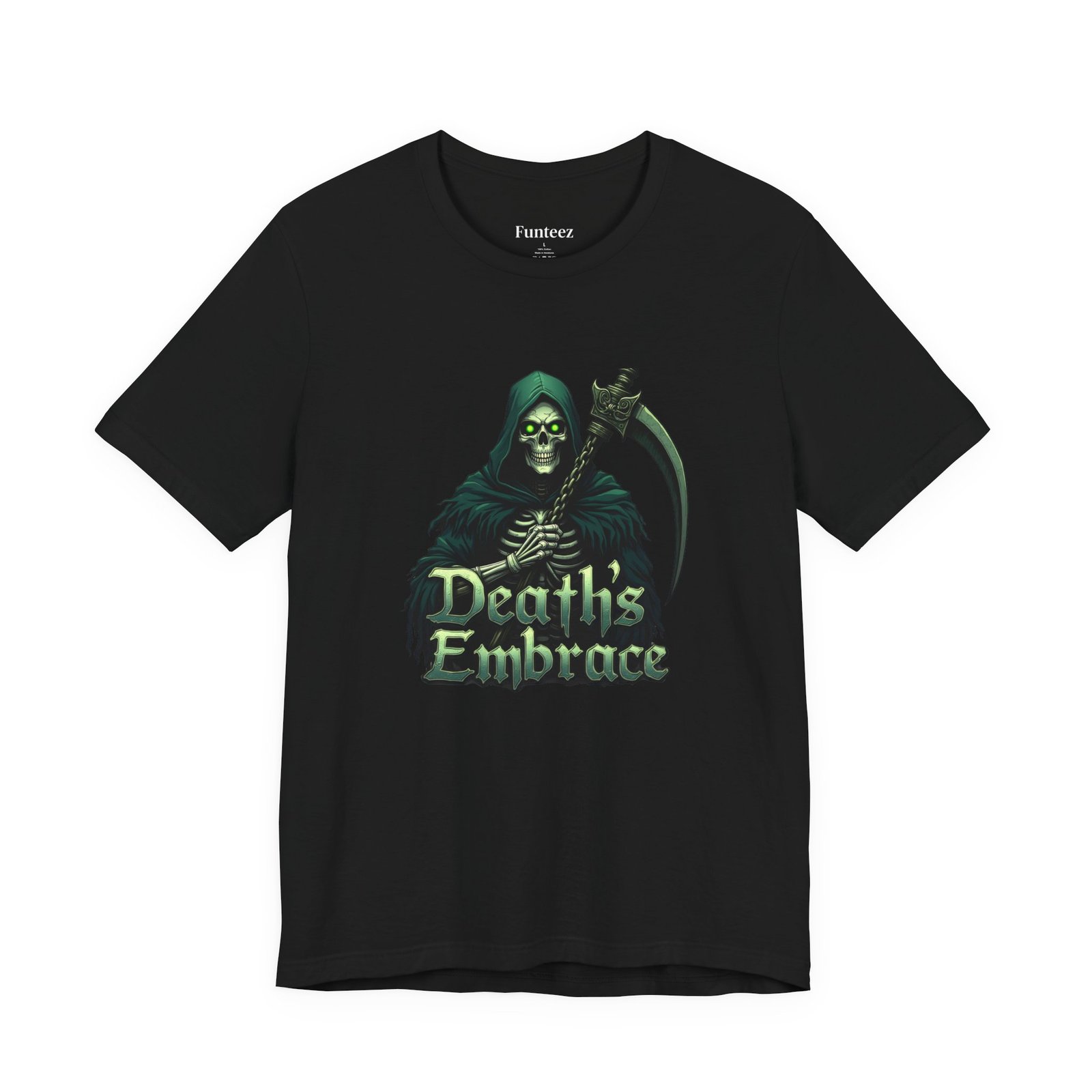 The Death’s Embrace tee captures the chilling elegance of the Grim Reaper, blending Dark Legends style with tattoo-inspired art. Cloaked in midnight green and wielding his razor-sharp scythe, the Reaper stands as both a warning and an invitation, symbolizing fate, inevitability, and fearless acceptance. This shirt is for those who walk the edge, unafraid of the unknown.