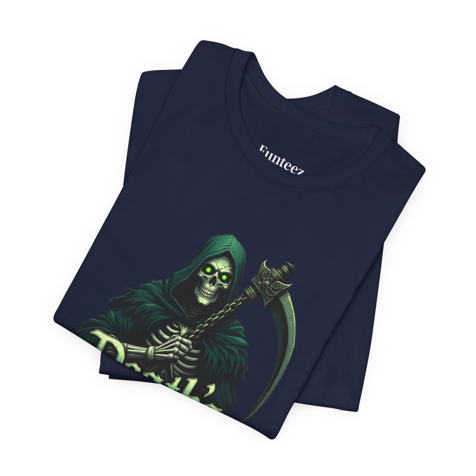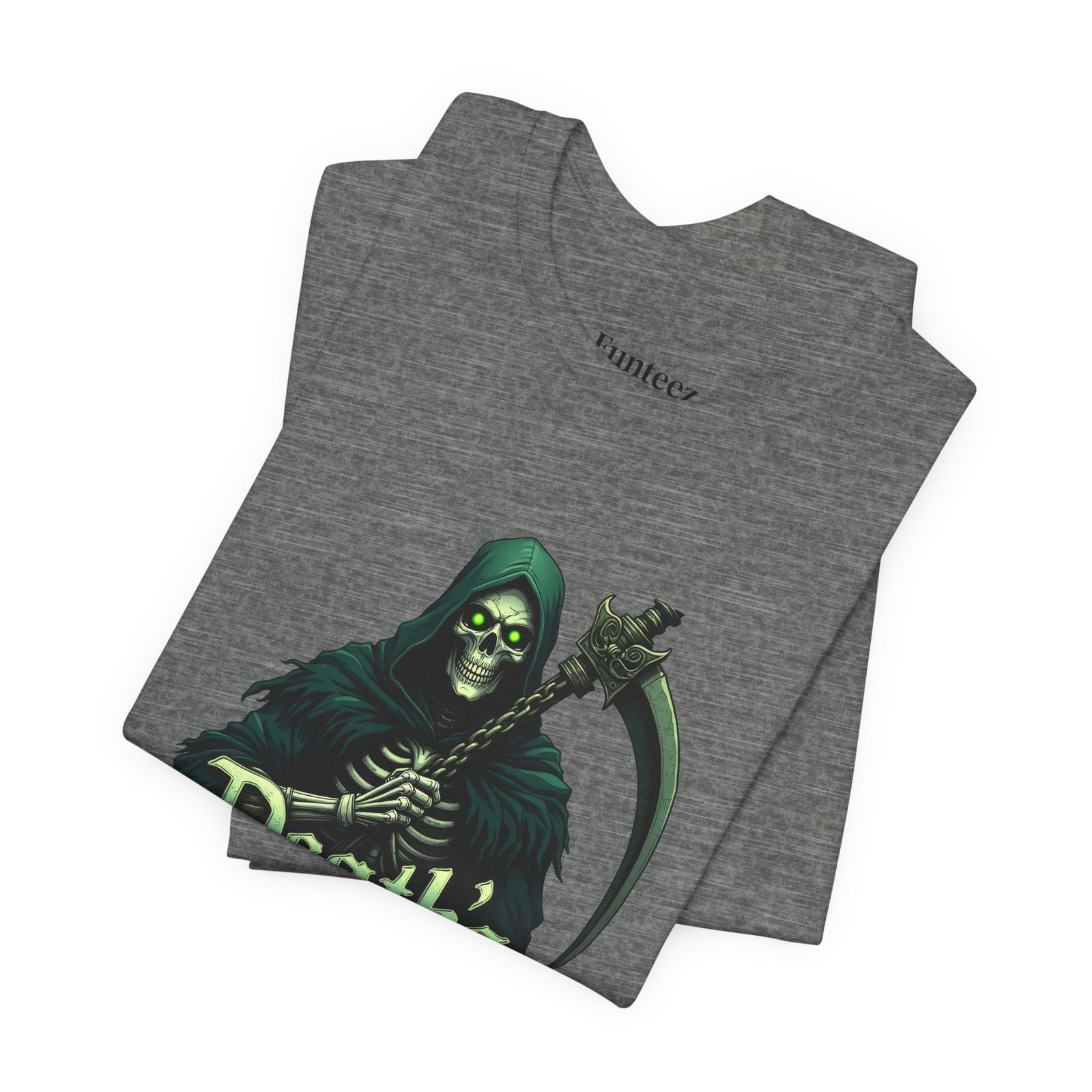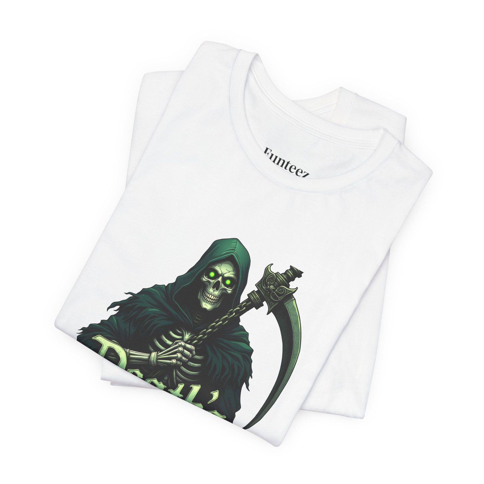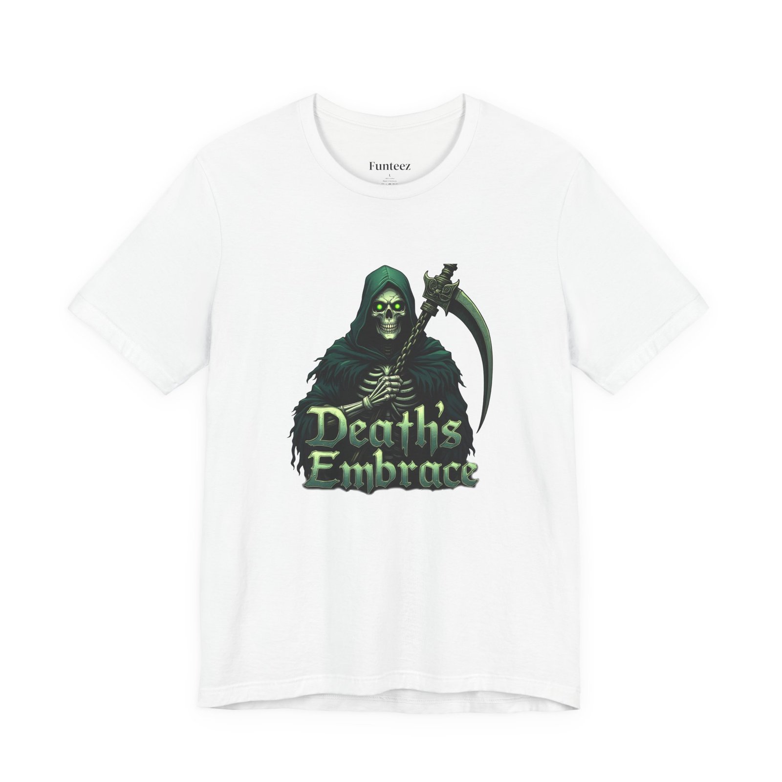 The Death’s Embrace tee captures the chilling elegance of the Grim Reaper, blending Dark Legends style with tattoo-inspired art. Cloaked in midnight green and wielding his razor-sharp scythe, the Reaper stands as both a warning and an invitation, symbolizing fate, inevitability, and fearless acceptance. This shirt is for those who walk the edge, unafraid of the unknown.